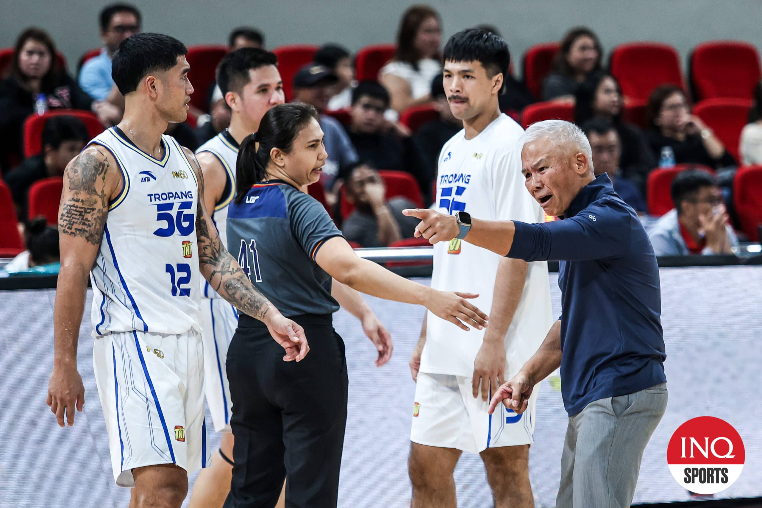 TNT Tropang 5G coach Chot Reyes argues with the game officials during the PBA Philippine Cup quarterfinals against Magnolia Hotshots. –MARLO CUETO/INQUIRER.net