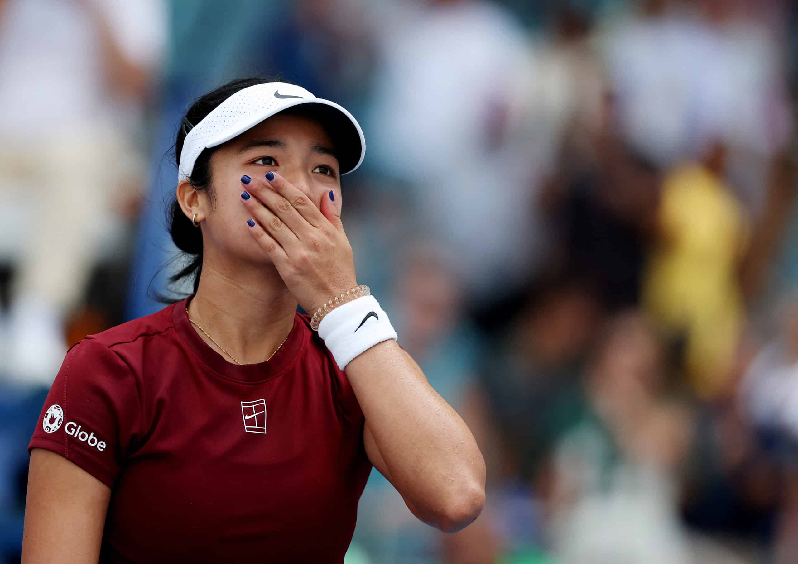 MIAMI GARDENS, FLORIDA – MARCH 26: Alexandra Eala of the Philippines reacts at match point after defeating Iga Swiatek of Poland on Day 9 of the Miami Open at Hard Rock Stadium on March 26, 2025 in Miami Gardens, Florida. Al Bello/Getty Images/AFP (Photo by AL BELLO / GETTY IMAGES NORTH AMERICA / Getty Images via AFP)