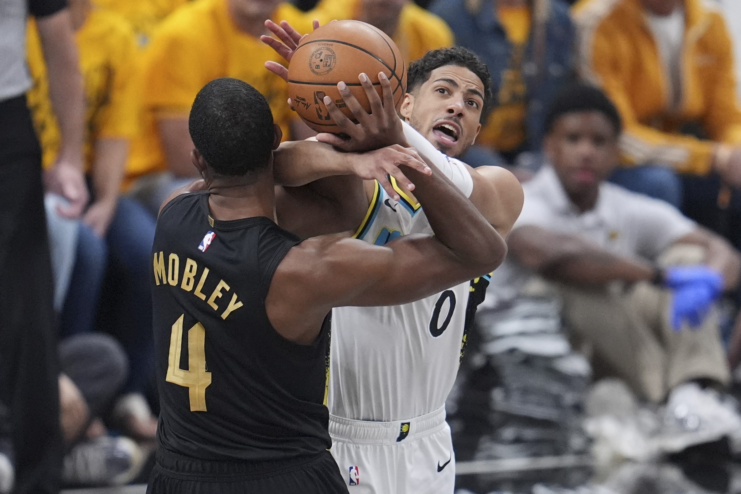 Indiana Pacers guard Tyrese Haliburton (0) and Cleveland Cavaliers center Evan Mobley (4) battle for the ball during the first half of Game 3 in the Eastern Conference semifinals of the NBA basketball playoffs in Indianapolis, Friday, May 9, 2025. (AP Photo/Michael Conroy)