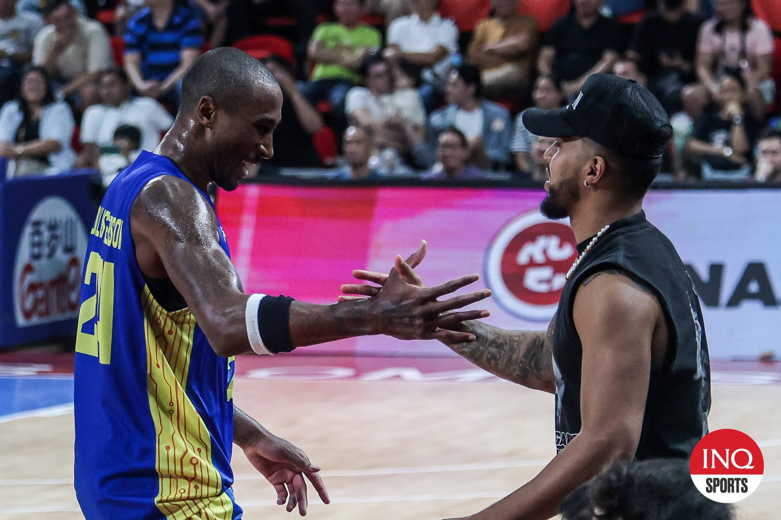 TNT import Rondae Hollis Jefferson and former star Mikey Williams exchange greetings during a PBA Commissioner’s Cup game. -MARLO CUETO/INQUIRER.net